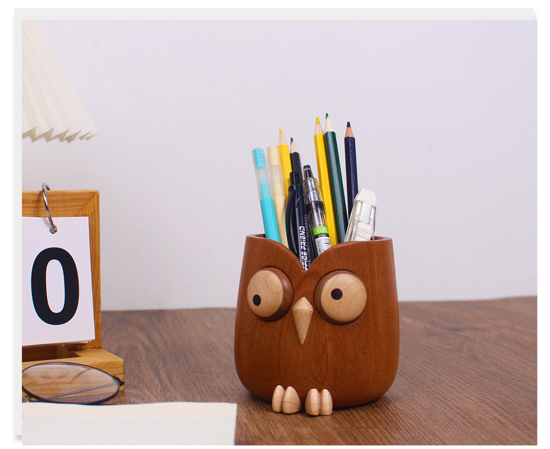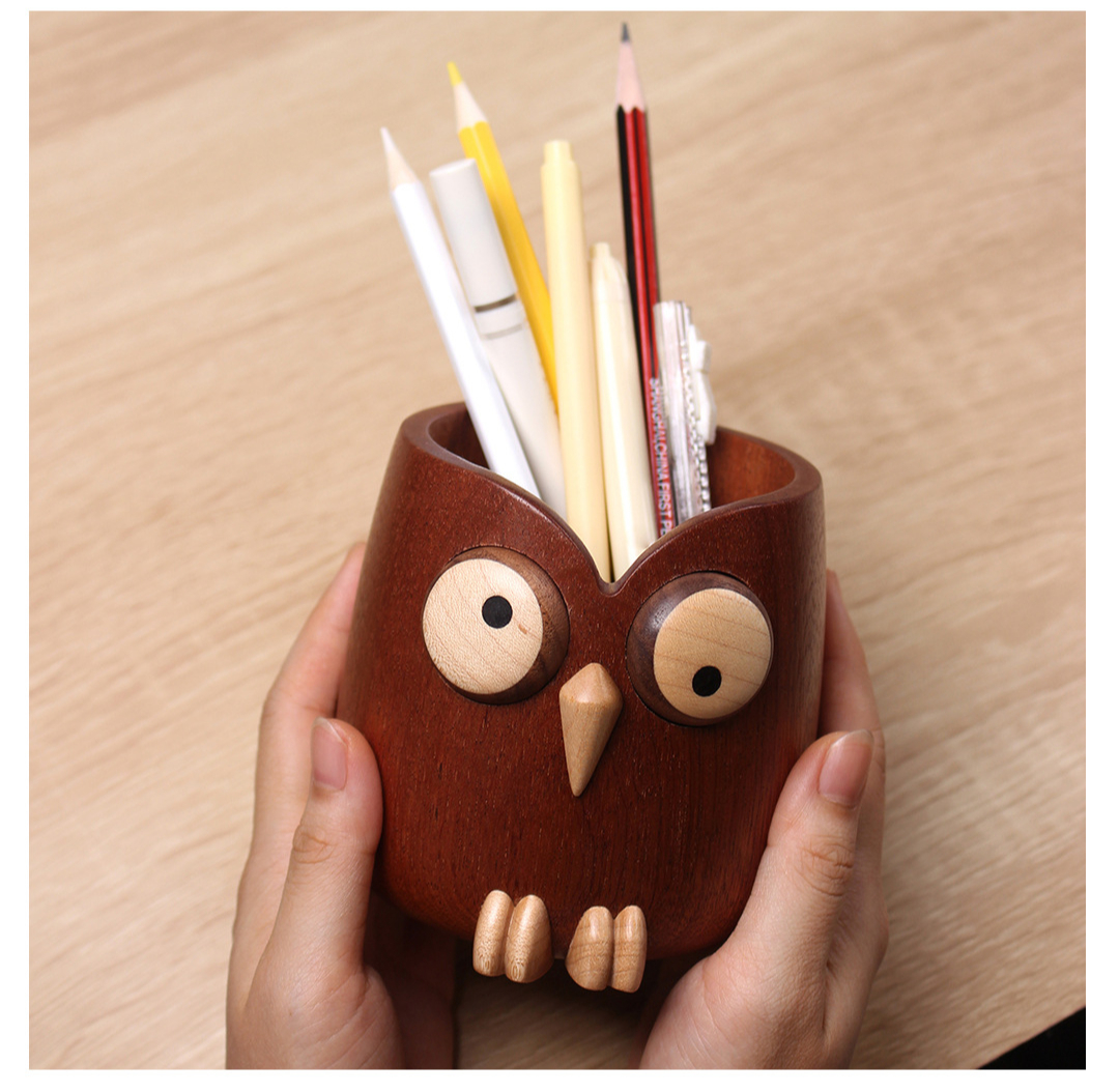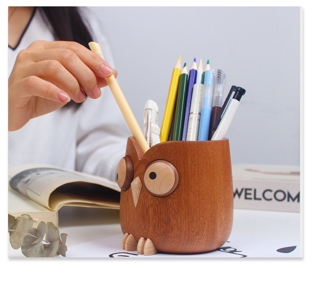 Owl Pen Holder Wooden Pen Holder Makeup Brush Storage Bucket Desktop Ornament Desk Pen Holder Office Stationery Pencil Case